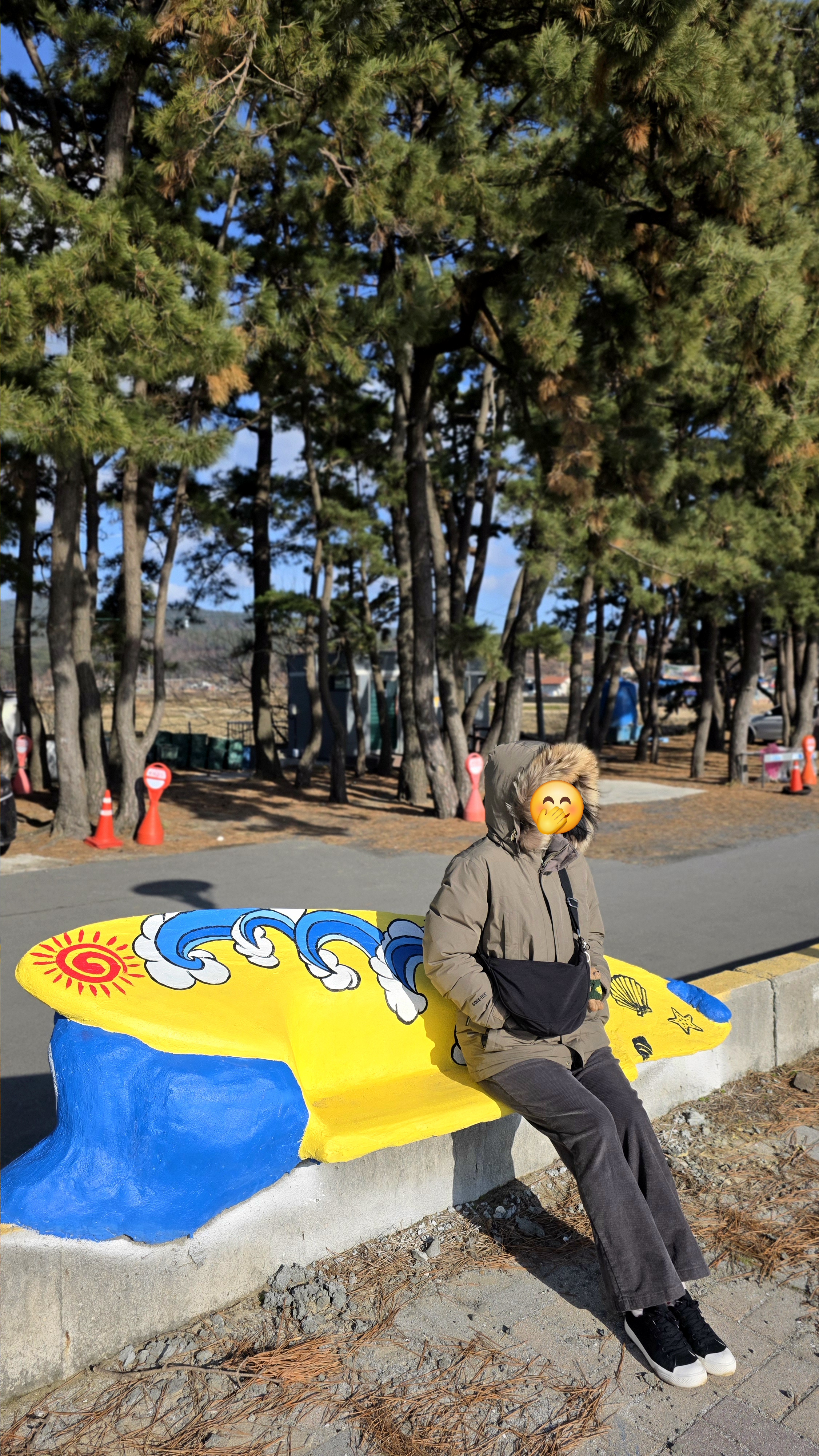 바다에 들어가기 전에 잠깐 벤치에 앉아서 경치를 감상하는 시간을 가져보아요. 바람이 세서 생각보다 추운 편이라 털모자가 달린 제 옷을 줬어요. 제 서윗함을 후대에 알리기 위해 증명사진을 남겨 놓습니다.