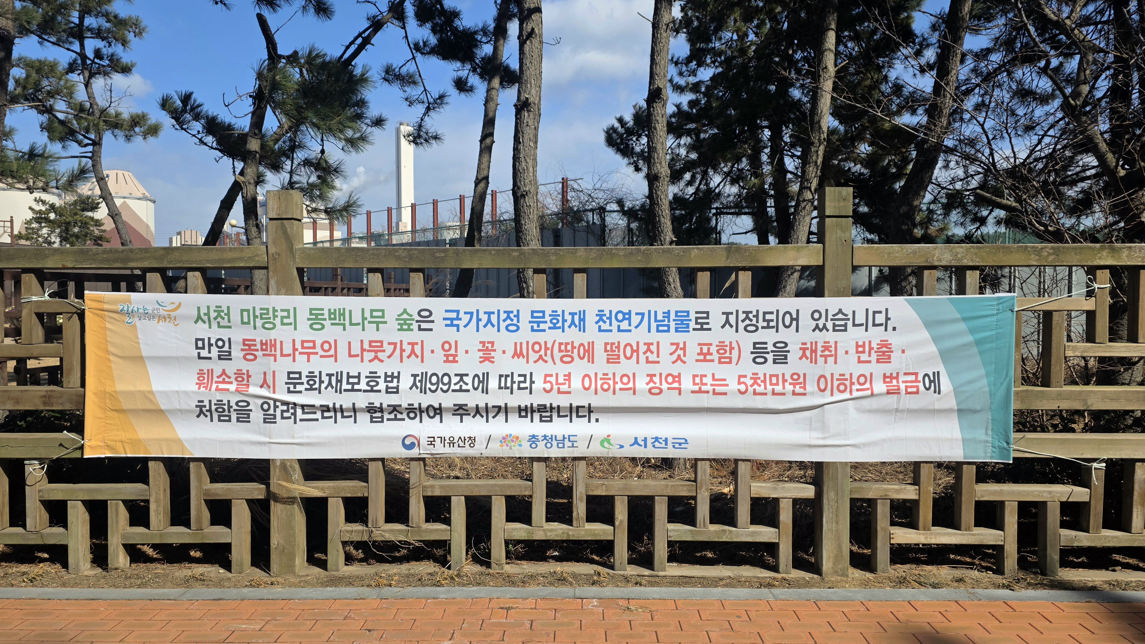 마량리 동백나무숲은 국가지정 천연기념물이라 훼손은 당연히 안 되고 땅에 떨어진 씨앗도 반출하면 안 된다고 합니다. 훼손 시 크게 경을 친다고 플래카드에 써 붙였어요 ㄷㄷ
