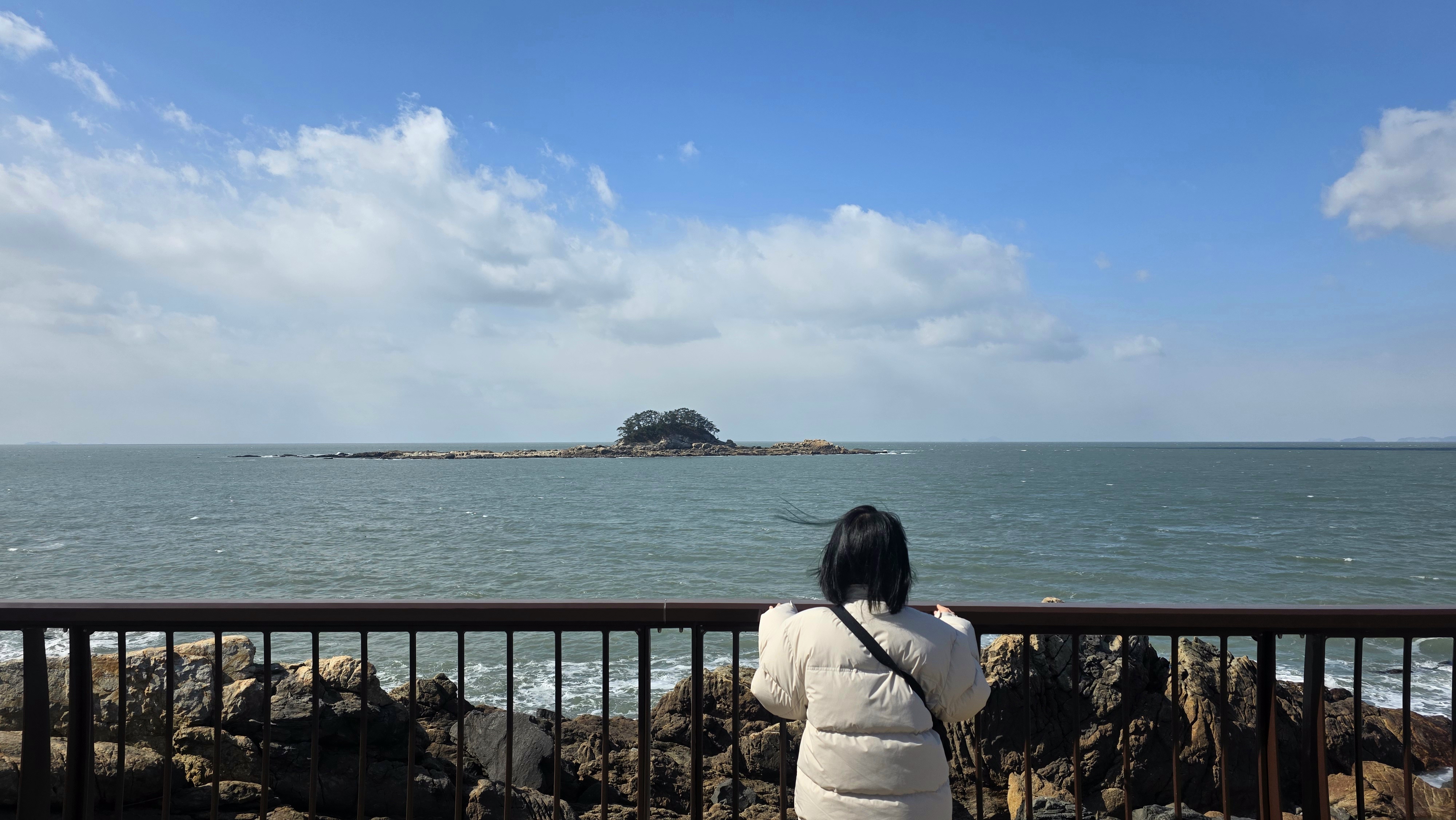 벤치 앞쪽의 계단길을 내려가면 오력도를 좀 더 가까이에서 볼 수 있는 바닷가 전망대가 나와요. 여기에서 보면 오력도가 또 다른 느낌이 듭니다.