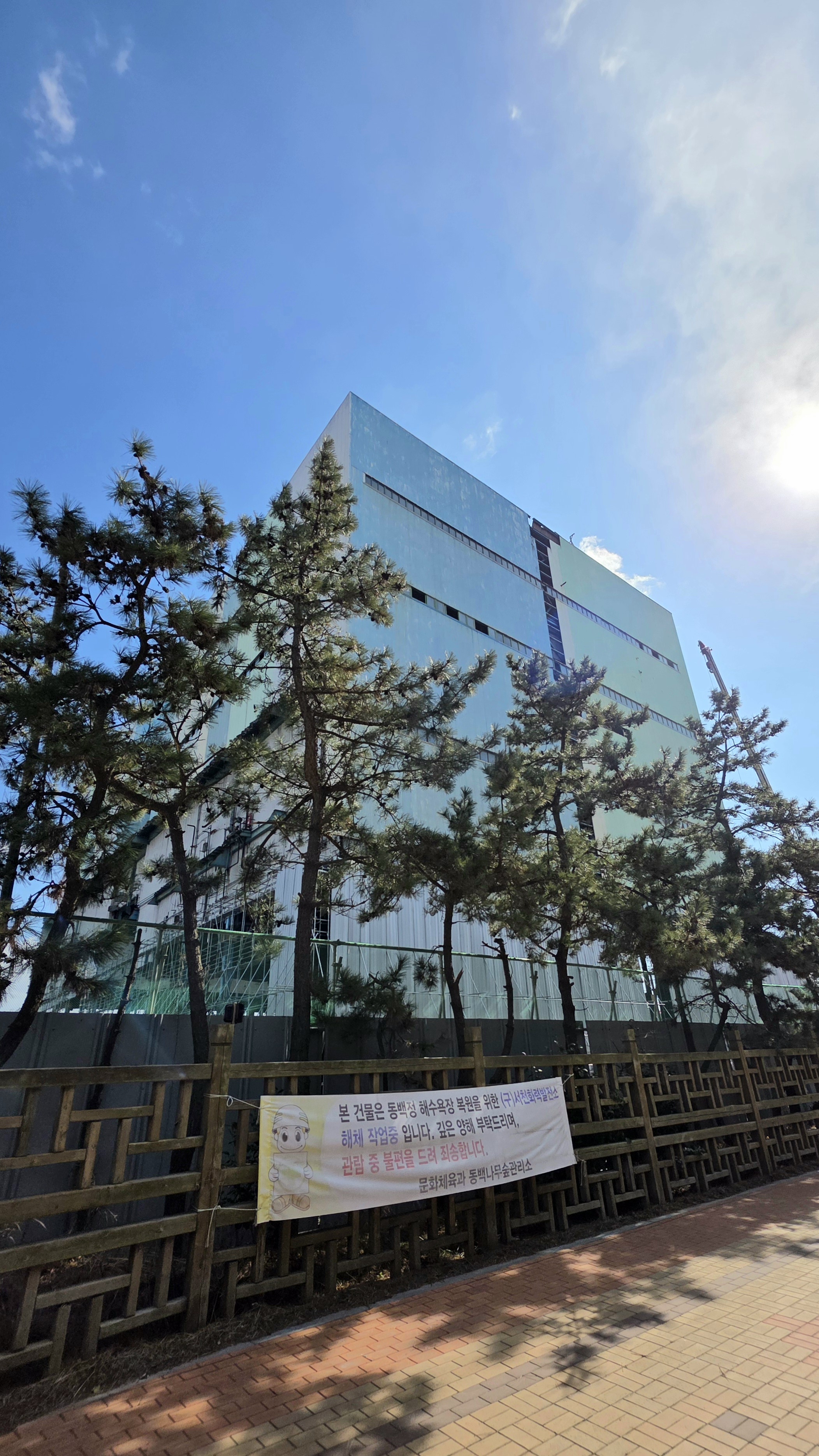동백나무숲 방향으로 걸어가는데 길 끝에 엄청 큰 건물이 보여요. 영화 촬영장소 같은 느낌의 폐 건물인데 구 발전소로 현재 철거작업 중인 곳입니다. 해체되고 나면 더욱 멋진 풍경을 보여줄 듯해요.