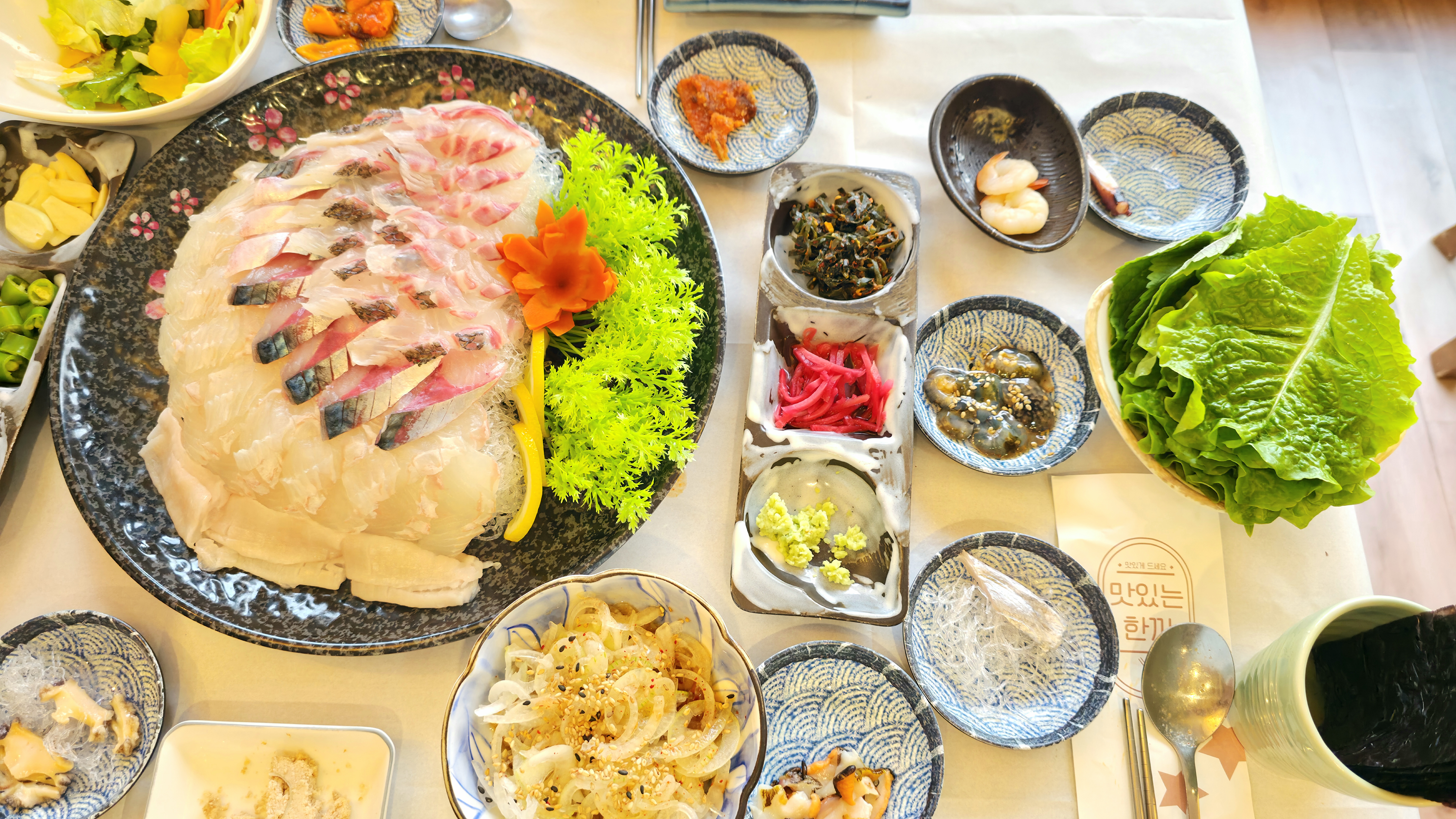 눈이 호강했으니 이제는 입이 호강할 차례겠죠? 오늘은 회를 먹기로 하고 근처 맛집으로 달려갑니다. 2층 자리 바다뷰가 괜찮은 영빈횟집에 자리를 잡아요.