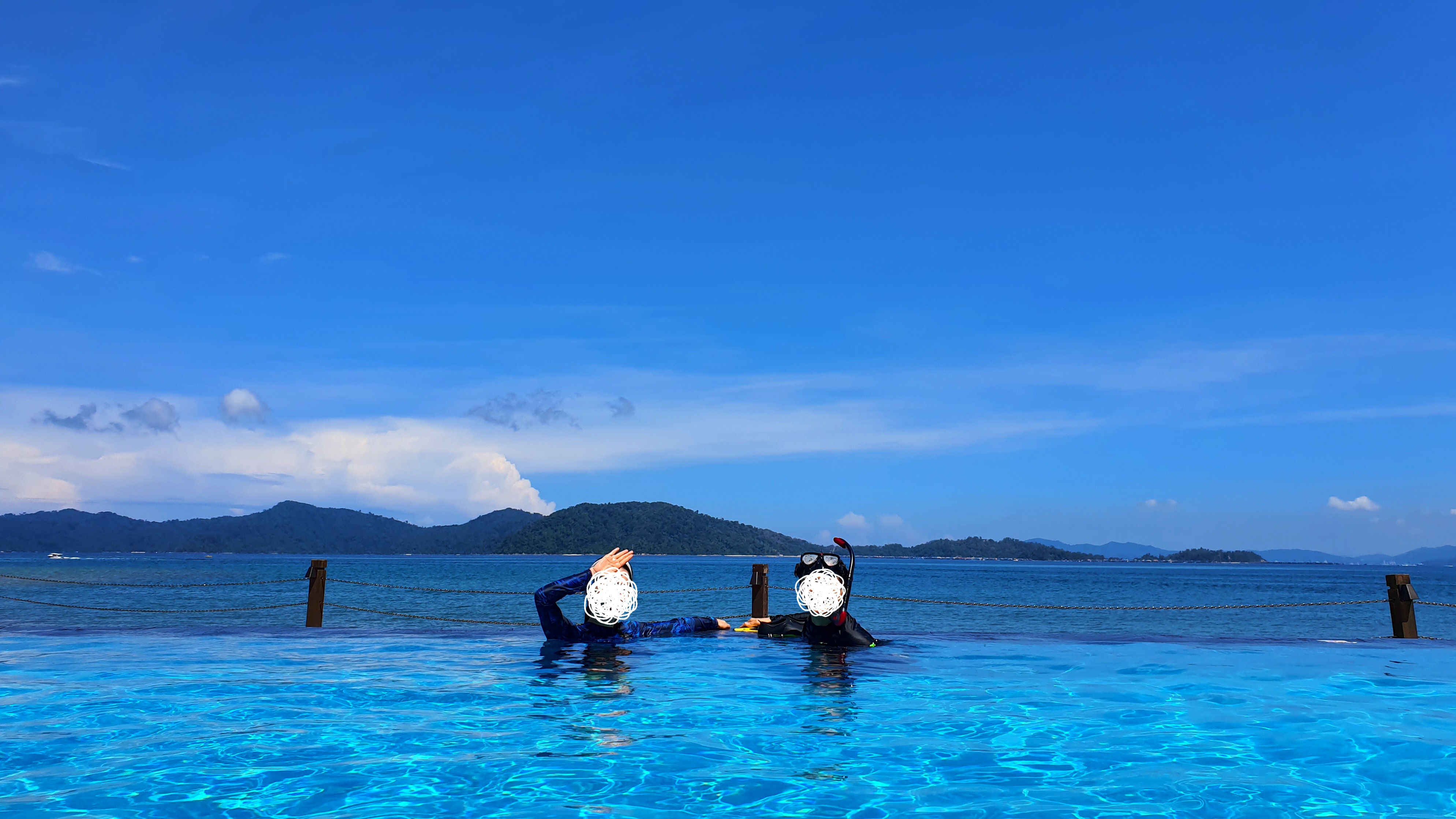주변을 걷다 보니 슬슬 더워져서 바로 수영장으로 풍덩! 우리나라처럼 주변에 미세먼지를 막 날려대는 나라가 없는 건지 하늘이 정말 파래요. 하늘도 파랗고 수영장도 파랗고 바다도 파랗고 완전체 인피니티풀입니다.